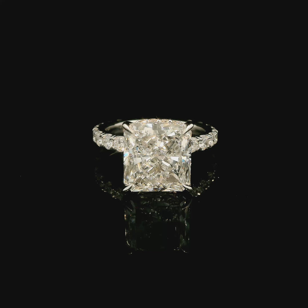Set in platinum, the design features a hidden halo that glows like a secret only the two of you share, 1.24ct of side diamonds that sparkle with every gesture and whisper the countless little moments that led to this one. The square radiant cut itself is a symbol of fire and strength, each facet catching light the way love catches moments, unexpected, and unforgettable.