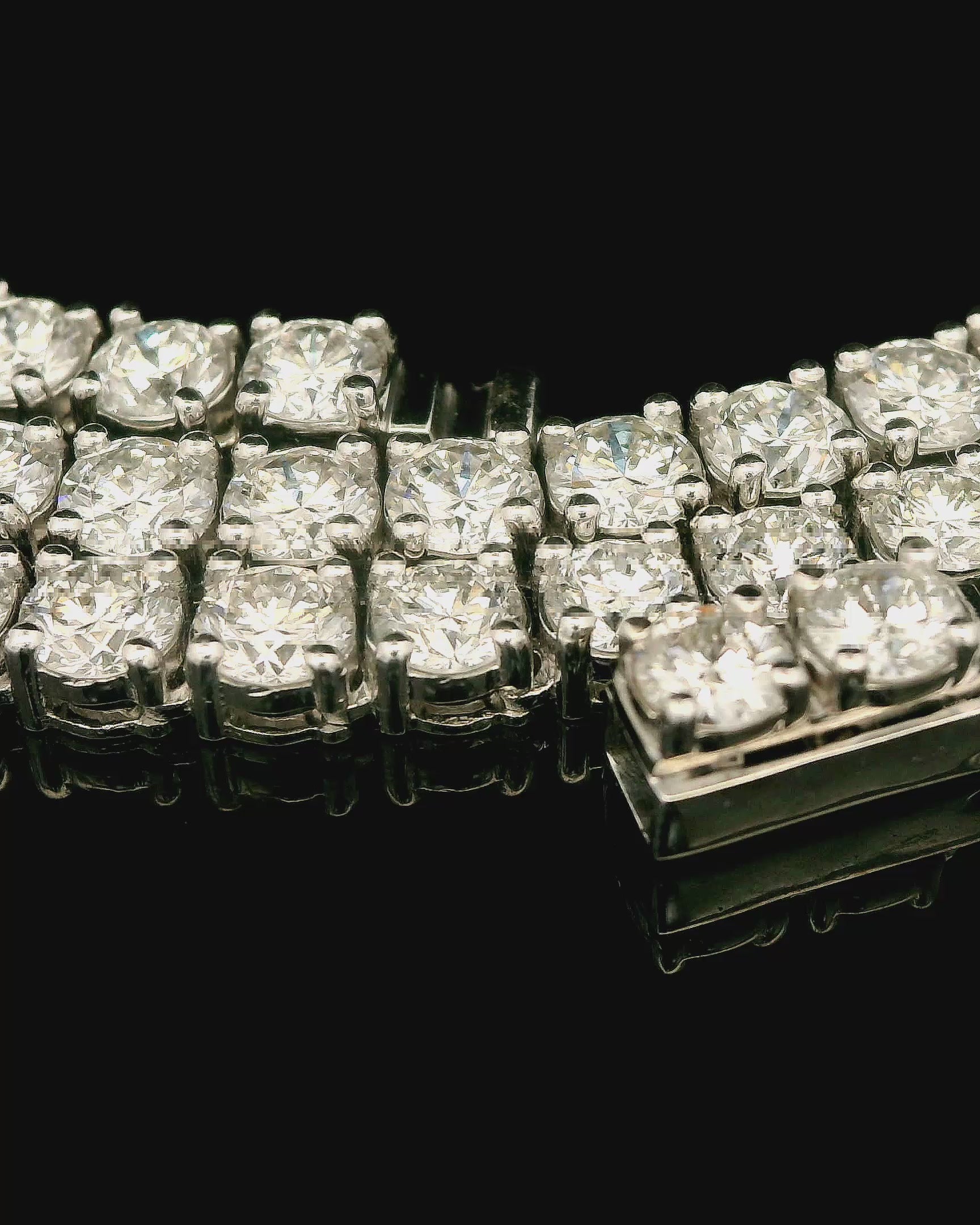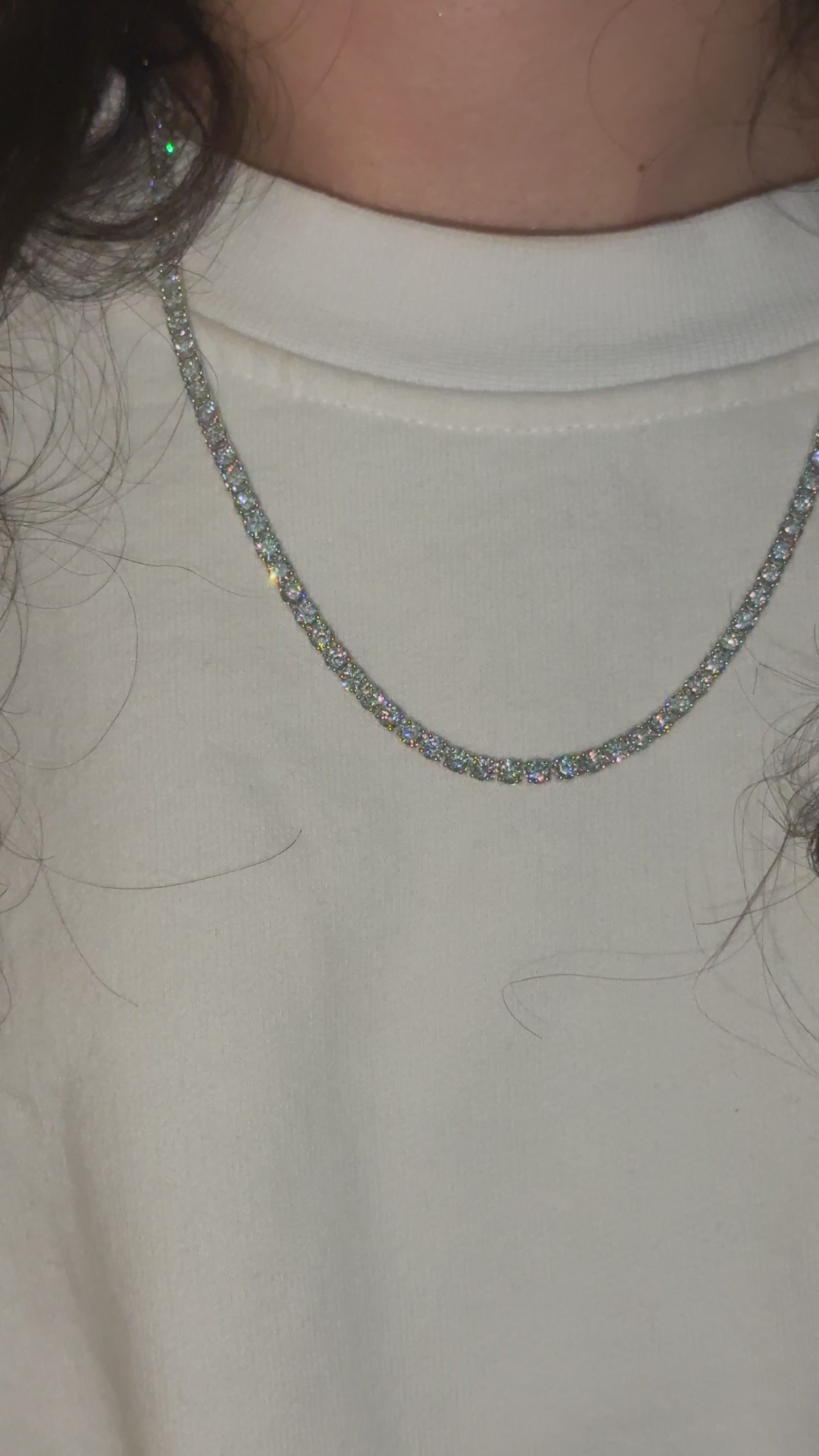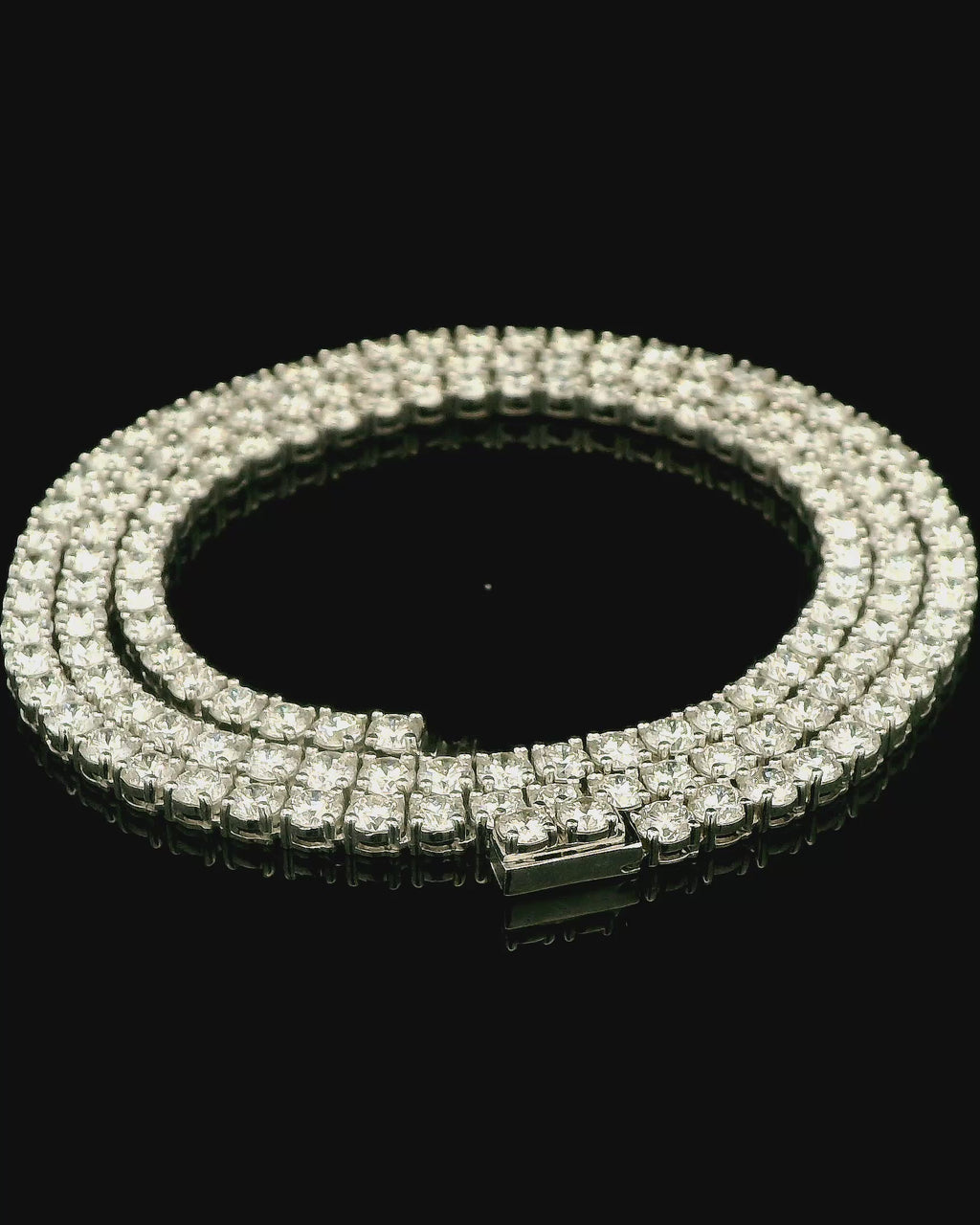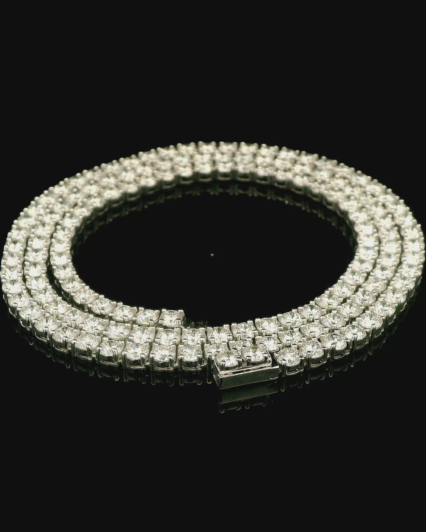 Featuring an extraordinary 21 carats of lab-grown VVS diamonds, this masterpiece glows with unmatched fire and precision. Each of its 139 perfectly cut 0.15 carat diamonds is hand-set in solid 14 karat gold, forming a seamless river of light that wraps gracefully around the neck. Measuring 3.5mm wide and 20 inches long, it offers the perfect balance between bold brilliance and refined sophistication.