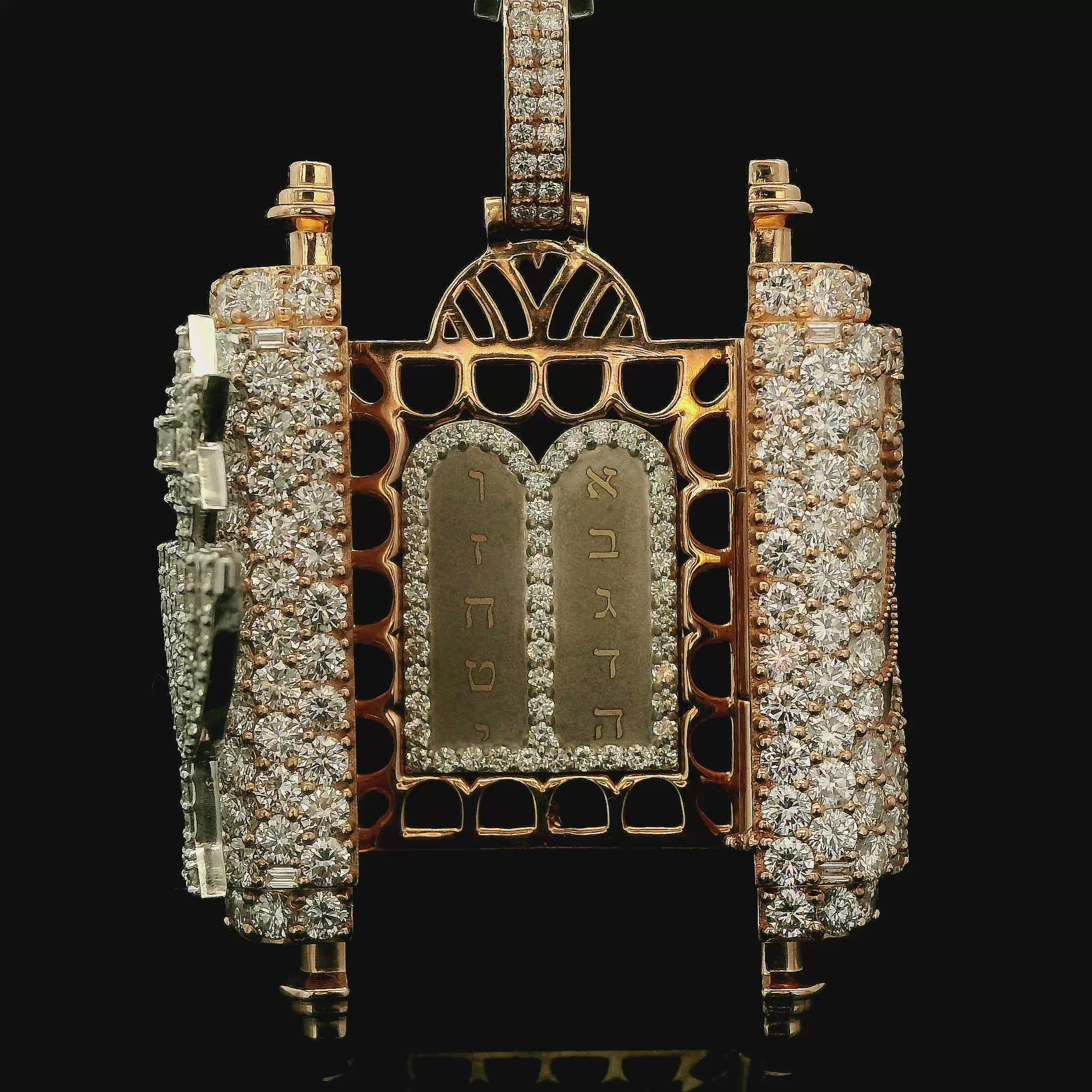 Handcrafted in NYC, this piece brings together the Torah scroll, Menorah, Star of David, and the Tablets of Moses, all covered in a breathtaking