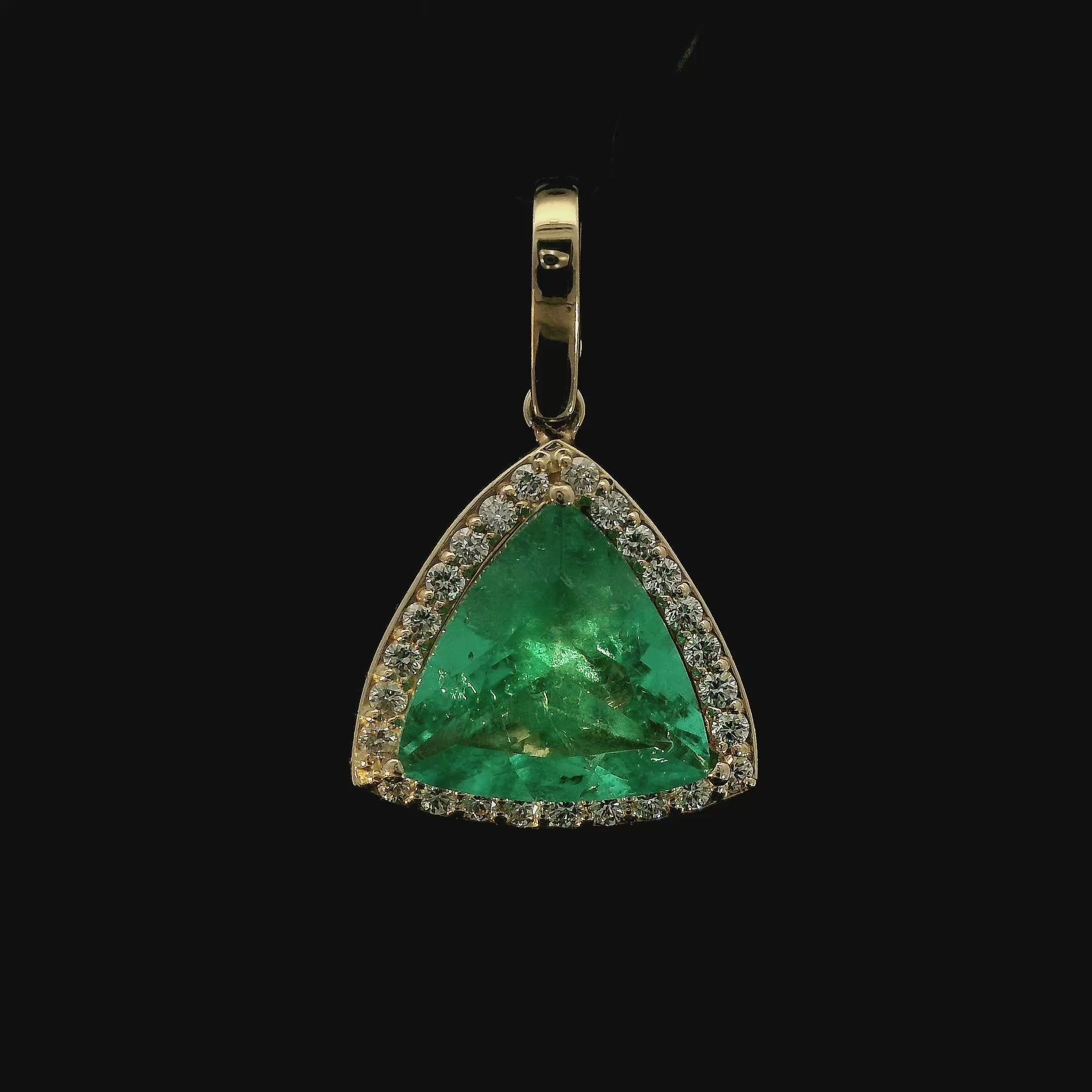 Colombian Emerald Trillion Cut Pendant 3.82 Carats with Diamond Halo